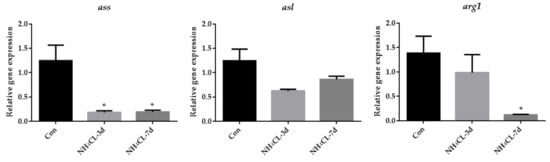 As the urea cycle in fish liver can transfer ammonia to less-toxic urea, the urea cycle was systemically evaluated. The expression of gs, which catalyzes the transfer from ammonia to glutamine, gradually up-regulated with prolonged ammonia exposure and was significantly higher after 7 days of ammonia exposure (Figure 5). However, the expression of cps III, otc, and ass was even down-regulated after ammonia exposure for both 3 days and 7 days. The expression of asl showed no significant changes, while the expression of arg1 was down-regulated after ammonia exposure for 7 days.