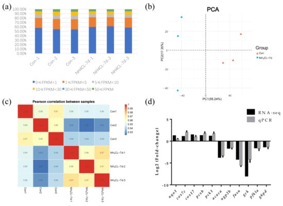 After removing low-quality reads by fastp from 297,885,618 raw reads, transcriptome sequencing generated 42,896,248 to 54,140,060 clean reads from the six libraries (Table 2). FPKM value can reflect the level of gene expression. So the FPKM value of each gene expression in each sample is shown in Figure 6a. Principal component analysis (PCA) was applied to assess the biological variability and to visualize the distribution of the two groups. The distance between points represents the overall representation difference of the sample. PC1 and PC2 represent different principal components; the numbers in parentheses represent principal component interpretation. The higher the principal component explainability, the greater the overall gene expression difference represented by the distance between sample points in this principal component vector dimension. As shown in the figure, there was no intersection of sample points between the ammonia nitrogen treatment group and the control group, indicating significant differences in gene expression between the two groups (Figure 6b). According to the Pearson correlation between samples, the correlation coefficient of intra-group samples is larger than that of inter-group samples, indicating that intra-group samples have good correlation and repeatability (Figure 6c). In order to confirm the accuracy of RNA-seq results, 12 genes were randomly selected for qRT-PCR assay, whose trends in qRT-PCR assay were consistent with RNA-seq results (Figure 6d). Thus, transcriptome data in the present study are stable and reliable.