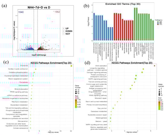 Analysis of the differentially expressed genes (DEGs) and GO enrichment and KEGG pathway analysis of DEGs. (a) Volcanic map shows the distribution of DEGs in the liver of largemouth bass after ammonia exposure for 7 days compared with the control group. Gray dots: genes with no significant difference, red dots: up-regulated genes with a significant difference, blue dots: down-regulated genes with a significant difference. (b) GO enrichment analysis of DEGs in largemouth bass liver after ammonia exposure for 7 days compared with control group. (c) KEGG pathway enrichment analysis of up-regulated DEGs. The size of the bubbles represents number of genes in a pathway, while the color represents rich factor. The X-axis represents −log10 (p-value). (d) KEGG pathway enrichment analysis of down-regulated DEGs. The size of the bubbles represents number of genes in a pathway, while the color represents rich factor. The X-axis represents −log10 (p-value).