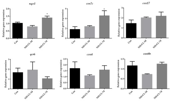 As mentioned above, oxidative phosphorylation was mainly enriched in KEGG enrichment analysis of up-regulated genes. Thus, oxidative phosphorylation was further examined systemically. As shown in Figure 8, the expression of representative genes involved in the oxidative phosphorylation pathway including nqo1, cox7c, cox17, qcr6, cox4, and cox6b were also evaluated. Results showed that the expression levels of nqo1 and cox7c were significantly up-regulated after ammonia exposure for 7 days, and cox17 expression level also showed a trend to increase, although it was not significant. The qcr6, cox4, and cox6b did not change significantly.