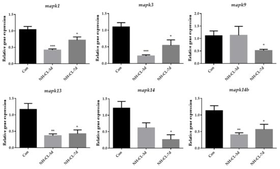 Similarly, MAPK signaling pathways were mainly enriched in the KEGG enrichment analysis of down-regulated genes. Then, genes involved in three subfamilies of the MAPK signaling pathway, including extracellular regulated protein kinases (ERK) (mapk1, mapk3), c-Jun N-terminal kinase (JNK) (mapk9), and p38MAPK (mapk13, mapk14 and mapk14b) were also evaluated via RT-qPCR. The results showed that the expression of mapk1 and mapk3, which are involved in ERK pathways, were significantly down-regulated after ammonia exposure for 3 days and 7 days (Figure 9). The expression of mapk9, which is involved in the JNK pathway, was significantly down-regulated after ammonia exposure for 7 days. Additionally, the expression of mapk13 and mapk14b, which are involved in the p38MAPK pathway, were significantly down-regulated after ammonia exposure for 3 days and 7 days.