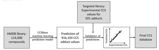The CCS database was generated according to the workflow described in Figure 3. Predictions were performed for almost 114,000 metabolites from the HMDB v4.0 database, generating 916,104 CCS adduct values. Results were validated with a validation set composed of 501 measured CCS adduct values from 297 standard compounds in both ionization modes.