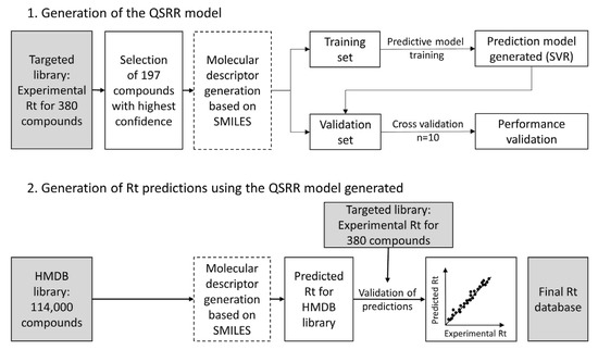QSRR Automator [38] builds regression retention models. Based on their SMILES, chemical structures were converted into their numerical representation by expressing them through structural descriptors produced by informatic algorithms of QSRR Automator. First, using a defined training data set, the machine learning algorithm learns the “rule” between molecular descriptors and their experimental Rt values to establish prediction models and select the best model. QSRR algorithm identifies descriptors that positively impact model performance. Selection and optimization of regression algorithms were carried out by automated procedures and evaluated thanks to the R2 score and mean absolute error. Then, the external validation data set is used to validate and evaluate the prediction error. Cross-validation (n = 10) provides an estimate of the accuracy of the Rt prediction for compounds that were not used in its development or optimization, evaluated thanks to the R2 score, mean absolute error, and SD. Once a valid model was selected, Rt predictions were performed for metabolites from the HMDB v4.0. The best fit of linear regression was calculated with an interval of +/− 2 SD.
