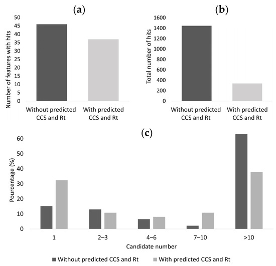 Contribution of the predicted CCS and Rt database to metabolite identification in untargeted metabolomics applied to toxicology. From the two match methods: (a) number of features with hits, (b) total number of hits (c), percentage distribution of features with different metabolite hits.