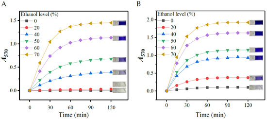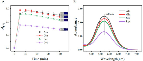 All of the chromogenic reactions were completed within approximately 60 min, since the A570 values peaked at this time (Figure 1). The A570 values were kept almost constant thereafter, which is conducive to ensuring the accuracy and reproducibility of a colorimetric measurement [31,35]. Reportedly, some organic solvents, such as ethanol, methylcellulose solution, and pyridine, could accelerate amino acid-ninhydrin reactions [31,36]. Ethanol has been considered to be a more ideal solvent given its easy availability and good compatibility with water [31].