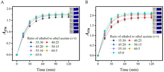 The facilitation of ethyl acetate to an amino acid-ninhydrin reaction cannot be directly evaluated due to its insolubility in water. However, ethyl acetate can be dissolved in an ethanol aqueous solution [31]. In this context, the effects of ethyl acetate were assessed by adding various levels (0, 10, 20, 25, 30, and 40%; v/v) of ethyl acetate to 40% ethanol-contained SINICS. As presented in Figure 2, the A570 value was raised with the ethyl acetate concentration, indicating that the chromogenic reaction is promoted by ethyl acetate. The reaction was also completed after 60 min because the A570 value plateaued at this time. The 25% ethyl acetate should be appropriate because it led to a nearly optimal chromogenic reaction. A composite solvent consisting of 40% ethanol and 25% ethyl acetate was thus determined. The total content of both organic substances in the solvent was 65% (v/v), which is consistent with not exceeding 70%, as reported [37].