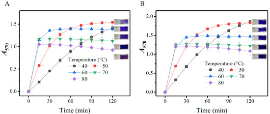 To identify an appropriate temperature for yielding color, the reaction was performed in the SINICS system under different temperatures (40, 50, 60, 70, and 80 °C) for 120 min. The results showed that both the A570 value and the reaction completion time were reduced with an increase in temperature (Figure 4). Specifically, 40 or 50 °C gave relatively high A570 values, but the reaction time was rather long. Under 60 °C, the reaction was completed within 30 min and had a moderate A570. At 70 or 80 °C, the A570 value was slightly lower than that at 60 °C, but the reaction could be finished within 15 min, a time comparable to those (10–30 min) of the classical coloring strategies [38]. It seemed that 70 °C is more appropriate than 80 °C because of a relatively high A570 value. The previous studies used a higher temperature (>85 °C), and even boiling water, for the color development [35,38,39]. However, an excessively high temperature may be not suitable for SINICS, as the resultant chromophore is unstable (Figure 4). After comprehensive consideration of the reaction completion time and A570, 70 °C was adopted in this study.