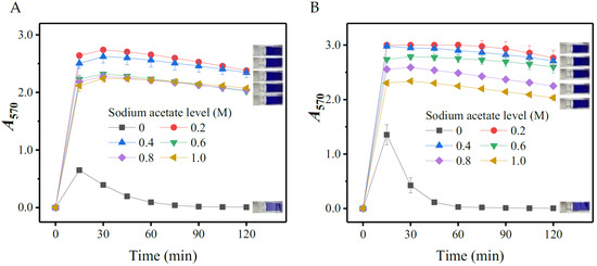 To investigate the influences of acetate level on chromogenic reaction, 35 μL various concentrations (0, 0.2, 0.4, 0.6, 0.8, and 1.0 M) of sodium acetate buffers (pH 5.0) were individually added into the chromogenic system. The results are summarized in Figure 6. Acetate could either strengthen the reaction or stabilize the chromophore. However, the higher level of sodium acetate, the lower the A570 value that was achieved. The 0.2 M acetate maximized the color yield, accompanied by a satisfactory chromophore stability [31,35,41].