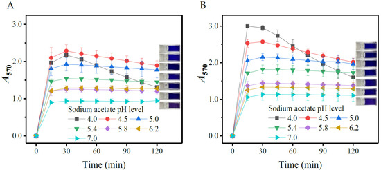 The ninhydrin-amino acid reaction could be performed in a wide pH range [38]. To check the influences of pH on the chromogenic reaction, 35 μL of 0.8 M acetate buffers with different pHs (4.0, 4.5, 5.0, 5.4, 5.8, 6.2, and 7.0) were individually included in the SINICS system. The reaction was conducted under 70 °C for 120 min, and the A570 was detected every 15 min. Figure 5 shows that the color development was accelerated at a lower pH, due to the fact that the formation of Ruhemann’s purple is acid dependent [38,40]. Nevertheless, the lower the pH, the poorer the stability of chromophore. A mild acid environment (pH 5.0) should be preferable for taking A570 and chromophore stability into account. The optimal pHs reported by different labs are somewhat different, but generally fall into a mild acid range of 5.0 and 6.0 [38].