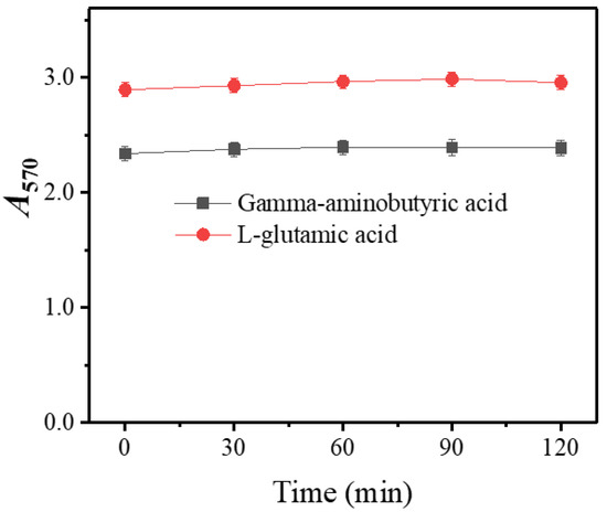 The chromophore stability is crucial for colorimetric analysis [4,38]. Upon the completion of color development, the solution was left at room temperature for 120 min, and its A570 was measured every 15 min. As shown in Figure 7, the chromophore resulting from GABA or L-glutamic acid was almost invariable for at least for 120 min, a duration long enough for colorimetric analysis [13,31].