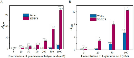 Chromogenic sensitivity of SIANCS to gamma-aminobutyric acid (A) and L-glutamic acid (B). The control reaction medium used water as a substitute for 40% ethanol-25% ethyl acetate. SINICS: sensitivity intensified ninhydrin-based chromogenic system; and A570: absorbance at 570 nm.