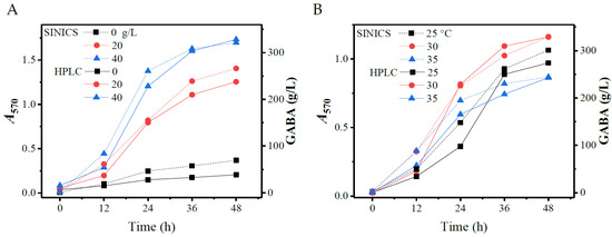 In this work, all of the samples were diluted by 400-fold with ultrapure water before the SINICS assay. The fresh fermentation medium (containing 0.2 M monosodium L-glutamate) saturated with L-glutamic acid should be used as the background control. However, the reading of 400-fold dilution of the medium without L-glutamate was negligible (<0.05). For convenience, the aqueous solution of 0.2 M monosodium L-glutamate saturated by L-glutamic acid powder was selected as the control in this work. All the samples also underwent HPLC analysis, as depicted in the Materials and Methods section. As shown in Figure 9, the plot of GABA production determined by SINICS followed that determined by HPLC, suggesting that SINICS could explicate the GABA fermentation process. In fact, the SINICS kit has been successfully used to optimize the whole-cell catalysis process of L. brevis CD0817 for the production of GABA [6].