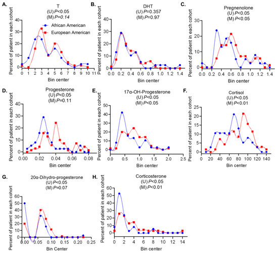 Serum distribution of testosterone (T), dihydrotestosterone (DHT), and intermediate metabolites in AA men and EA men. Differences in the serum metabolite levels between African American (AA) and European American (EA) men were compared using a left-censored version of the log-rank test in the univariate analysis. A multivariable Tobit regression model was used to compare metabolites between racial and Gleason groups while adjusting for confounders. (A,B) Distribution of serum androgen levels, T and DHT, in AA and EA men with prostate cancer. (C–H) Distribution of serum levels of intermediate metabolites produced during androgen biosynthesis in AA and EA men with prostate cancer. Blue lines represent the frequency of distribution of T and DHT levels in the serum of AA men and red lines represent the frequency of distribution of T and DHT levels in the serum of EA men. The p-value represents significant differences between AA and EA men from the univariate analysis (U) and multivariate analysis (M) that adjusts for age and grade.