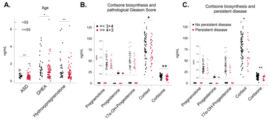 Serum metabolite levels are associated with clinical cofactors. The metabolite levels within groups of clinical cofactors were compared using a left-censored version of the log-rank test. * p < 0.05, ** p < 0.01 upon comparisons of the mean values in each category. Each dot represents a single clinical serum sample. (A) The mean androstenedione (ASD), dehydroepiandrosterone (DHEA), and hydroxypregnonolone serum levels are significantly higher in men <55 years than in men >=55 years with prostate cancer. (B,C) The mean cortisol and cortisone serum levels are lower in men with a prostate cancer Gleason Score >= 4 + 3 and persistent disease. The insets in each panel have alternate Y-axis to accurately depict the distribution of pregnenolone and 17-α-OH-progesterone.