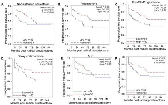A subset of intermediate metabolites produced during androgen biosynthesis is reflective of a shorter time to disease progression. The metabolite levels were dichotomized into low (<=50th percentile) and high (>50th percentile). The time-to-event outcomes were then summarized by the categorized metabolite levels by using standard Kaplan–Meier methods, and associations were evaluated with standard log-rank tests. (A–F) Lower levels of intermediate androgen metabolites were found to be associated with a shorter time to disease progression; represented as progression-free survival on the Y-axis. ASD: androstenedione and T: testosterone.