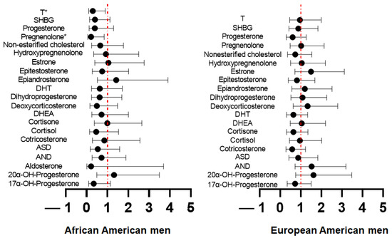 There are few studies that report race-specific differences in the levels of androgens and intermediate metabolites. In the non-diseased state, AA men have increased DHT levels in the serum compared with EA men [11,12,13]. High serum levels of total cholesterol are associated with a high risk of developing prostate cancer and are a significant risk factor for recurrent disease in AA men [14,15]. Compared with EA men, prostate cancer tissues from AA men have similar DHT and T levels but have significantly higher levels of intermediate androgen metabolites such as DHEA and ASD [16,17]. In castration recurrent disease, DHEA and T levels, among other intermediate metabolites, are higher compared to levels prior to castration in the same men [18]. Other studies show altered lipid metabolism, including triglycerides and phosphatidic acid levels, between AA and EA men with prostate cancer [19,20]. However, the race-specific differences of DHT, T, and intermediate androgen metabolites, specifically in the serum of men with localized, therapy naïve disease, are not clearly elucidated.