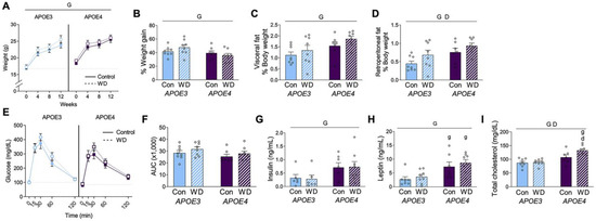 Metabolic profiles in APOE mice after Western diet. (A) Body weight was measured at the start and at four-week intervals in female APOE mice on control (Con; open circles) and Western diet (WD; filled squares). The dotted line indicates the initial weight of the APOE3 mice. (B) The percent weight change was calculated from the beginning to the end of the experimental period. (C,D) Fat pads from (C) visceral and (D) retroperitoneal depots were removed and weighed at the conclusion of the experiment. Values are expressed as a percentage of body weight. (E) Results from an oral glucose tolerance test that was administered after 12 weeks of diet. (F) The area under the curve was calculated for the GTT. (G–I) Plasma was collected under fasting conditions at the end of the experiment and measured for (G) insulin, (H) leptin, and (I) cholesterol. Data are shown as individual values (open circles) and mean values (+SEM) from n = 7–8 mice per group. “G” indicates a significant main effect of the APOE genotype, “D” indicates a significant main effect of diet, “g” indicates a significant difference from the APOE3 mice on the same diet, “d” indicates a significant difference from animals with the same APOE genotype on the control diet. Significance is p < 0.05.