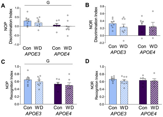 Behavioral effects in APOE mice after the Western diet. Animals were tested with (A,C) novel object placement (NOP) and (B,D) novel object recognition (NOR) behavioral tasks. The discrimination index is represented in (A,B), with values > 0 indicating positive performance. The recognition index is represented in (C,D). Data are shown as individual values (open circles) and mean values (+SEM), from n = 5–8 mice per group. “G” indicates a significant main effect of the APOE genotype. Significance is p < 0.05.