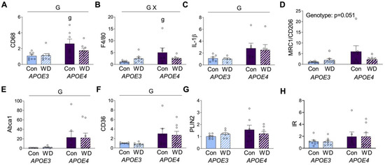 Gene expression levels in visceral adipose tissue. Results of mRNA quantification studies in APOE3 (blue) and APOE4 (purple) mice maintained on control (Con; solid bars) or Western (WD; hatched bars) diets. Gene targets included the macrophage markers (A) CD68 and (B) F4/80, the inflammation-related markers (C) IL-1β and (D) CD206, and the metabolic macrophage markers (E) Abca1, (F) CD36, (G) PLIN2, and (H) insulin receptor (IR). Data show fold difference as individual values (open circles) and means (+SEM) relative to the Con APOE3 group from n = 7–8 mice per group. “G” indicates a significant main effect of APOE genotype, “X” indicates a significant interaction effect between APOE and diet, and “g” indicates a significant difference from APOE3 mice on the same diet. Significance is p < 0.05.