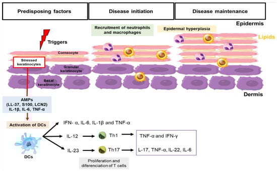 The orchestrated cascade of pathogenic events triggers psoriatic inflammation, activating keratinocytes, which become a source of antimicrobial peptides (AMPs) such as cathelicidins (LL-37), β-defensins, S100 family peptides, lipocalin 2 (LCN2), interleukins (IL)-1β, IL-6, and tumor necrosis factor alpha (TNF-α) (Figure 1) [27,28]. Such mediators induce innate immunity pathways, representing the first line of response for skin cells to the pathogenic environment of psoriasis (Figure 1) [27,28,29,30,31,32]. Then, the dermal dendritic cells are activated, producing IFN-α, IL-6, IL-1β, and TNF-α, and they migrate to the draining skin lymph nodes where they promote the differentiation of naive T cells into helper T cells—Th1 and Th17 (Figure 1) [1]. The stimulation of Th1 lymphocytes to secrete pro-inflammatory molecules, such TNF-α and IFN-γ, leads to the induction and maintenance of skin inflammation and increases the proliferation of keratinocytes in the epidermis. In turn, Th17 lymphocytes activated by IL-23 secretes effector cytokines, such as IL-17, TNF-α, IL-22, and IL-6 [32]. These cytokines lead to the inflow of neutrophils and other inflammatory cells to the skin, excessive proliferation of keratinocytes, and parakeratosis (Figure 1) [32,33,34,35,36].