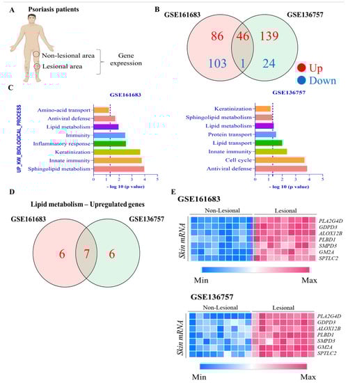 Importance of lipid metabolism in biological processes in psoriasis lesioned skin. (A) The gene expression as analyzed in non-lesioned and lesioned skin of patients with psoriasis from GSE161683 and GSE136757. (B) Venn diagram showing up- and down-regulated genes in the two datasets. (C) Up-regulated biological process. (D) Venn diagram showing up-regulated genes related to lipid metabolims in the two datasets. (E) Heat map showing expression gene profiles comparing non-lesional and lesional skin from the GSE161683 and GSE136757 datasets.