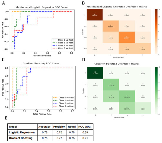 Machine learning algorithm for the classification of clinical stages based on untargeted metabolomics. (A,B) The Multinomial Logistic Regression model: “pre-surgery”: 0; “post-surgery”: 1; “pre-radiation”: 2; “post-radiation”: 3. (A) The receiver operating characteristics (ROC) curve. (B) The confusion matrix when tested on the test dataset. (C,D) The Gradient Boosting model: (C) the receiver operating characteristics (ROC) curve; (D) the confusion matrix when tested on the test dataset. (E) Model performance comparison: Comparison of multinomial regression and Gradient Boosting models based on the accuracy, precision, recall, and ROC AUC score of the testing dataset.