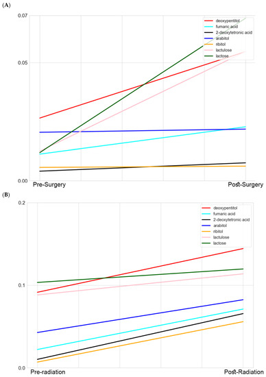 Comparing post-surgery to pre-radiation, there was a significant increase (p < 0.05) in deoxypentitol, heptanoic acid, leucine, and isoleucine, while there were no significant changes for other metabolites (Supplementary Figure S2C). Comparing post-surgery to post-radiation, a significant increase, p < 0.01, was found for deoxy-pentitol and p < 0.001 for arabitol (Supplementary Figure S2C).