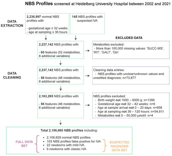 Data extraction and data cleaning flow chart for NBS data screened at the NBS laboratory at Heidelberg University Hospital. NBS profiles from normal and suspected IVA newborns are extracted. From both data sets, features and NBS profiles are excluded due to missing entries and implausible values resulting in 2,106,960 NBS profiles with 60 features including 48 metabolites and 8 additional variables each.