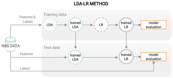 For NBS, it turns out that adapted ML methods, such as using newly constructed features or combining several methods are beneficial [,,,]. Furthermore, we propose three new combined methods LR based on LDA dimensions (LDA-LR), RR based on LDA dimensions, (LDA-RR) and SVM based on LDA dimensions for application in NBS for IVA. The workflow of these methods is exemplarily presented in Figure 2 for the LDA-LR method. First, the NBS data are split into training and test data. Then the training data including features and labels are used to train an LDA and transform the features to LDA dimensions which are utilized as input to train and subsequently evaluate an LR classifier. The trained LDA and LR models are then applied to the features of the test data set and the predictions are compared to the test data labels to evaluate the model.