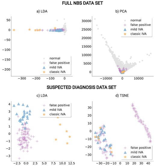 For the full NBS data set, a strict separation of clusters is not possible, although, for both, LDA and PCA, the newborns with mild and classic IVA were more closely grouped with each other and with the falsely positive diagnosed newborns than with the normal NBS profiles, Figure 3a,b. The suspected diagnosis data set transformed into LDA dimensions show three distinct clusters for groups of false positives, mild IVA, and classic IVA, Figure 3c. TSNE for the suspected diagnosis data set separates a large group of false positives from the remaining data, Figure 3d. Hence, for further investigation, we excluded the 5 significant features, based on ANOVA, Trp, argininosuccinate (Asa), 3-methylglutarylcarnitine (MeGlut), 3-OH-tetradecanoylcarnitine (C14OH), and histidine (His) and applied the TSNE algorithm again, the results of this evaluation showed no distinct separation into two clusters, Supplementary Figure S3. Hence, these features seem to have an important influence on the TSNE method. Furthermore, we compared the scatter plots of TSNE dimensions colored depending on the confirmed diagnosis and the classification of an LR algorithm, Supplementary Figure S2. This comparison showed that the LR method identifies all NBS profiles, which can be visually separated from other NBS profiles in TSNE dimensions (right cluster), correctly as normal (purple), Supplementary Figure S2b.