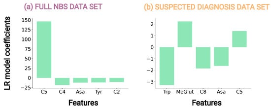 The application of LR allows for an interpretation of its feature contributions, as it is interpretable on a modular level, meaning that it can be inherently explained how parts of the model affect predictions []. Hence, we analyzed the LR coefficients of the LR models on full and suspected diagnosis data set with all features, Table 3, for interpretation of the methods and analysis of influential metabolite concentrations, Figure 4. Traditional NBS only considers C5, whereas analyzing the coefficients of LR on the full data set identified C5, butyrylcarnitine (C4), Asa, tyrosine (Tyr), acetylcarnitine (C2) as the features with the absolute largest model coefficients, Figure 4a. The coefficient of C5 shows a large positive value, 146, which can be interpreted as an increase in C5 can increase the probability that the NBS profile is classified as a newborn with IVA by the LR model, whereas the increase of a feature value with a negative coefficient such as C4 influences the model in the opposite direction, Supplementary Table S3B. For the suspected diagnosis data set, Trp, octanoylcarnitine (C8), and Asa have the largest negative LR coefficients, whereas MeGlut and C5 have the largest positive LR coefficients, Figure 4a. Trp having the largest negative value, can be interpreted as an increase in the feature value of Trp increases the probability that the NBS profile is classified as a normal newborn by the LR model, Supplementary Table S3C. For both data sets, C5 shows large positive coefficients and hence, the interpretation corresponds to an increased C5 level being a known primary marker of the common NBS for IVA [,,].