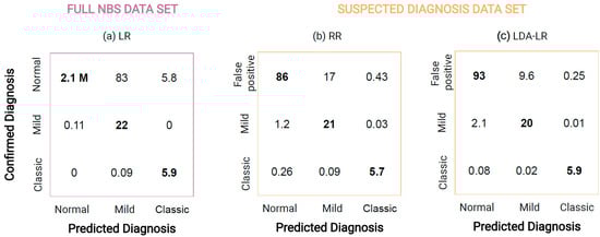 Confusion matrix displaying mean results of 100 independent runs for classification of normal (including false positives), mild IVA, and classic IVA applying (a) LR on full NBS data set and for classification of false positive, mild IVA, and classic IVA applying (b) RR on suspected diagnosis data set and (c) LDA-LR on suspected diagnosis data set. Prediction agreeing with the confirmed diagnosis is highlighted in bold.