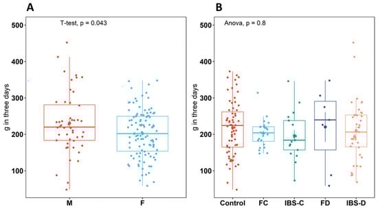 Total sum (g) of dietary protein intake over three days recording using diet diaries for each participant between (A): male and female individuals (B): between healthy control (control), IBS subtypes (IBS-C, IBS-D), and functional groups (FC, FD), data from males and females combined. Boxplots show the median (center line), 25th and 75th percentile (top and bottom of boxes, respectively), and whiskers representing 1.5 times the interquartile range. Abbreviations: healthy control (control), functional constipation (FC), IBS-constipation (IBS-C), functional diarrhea (FD), and IBS-diarrhea (IBS-D). Colors identifies subtype or healthy control groups.