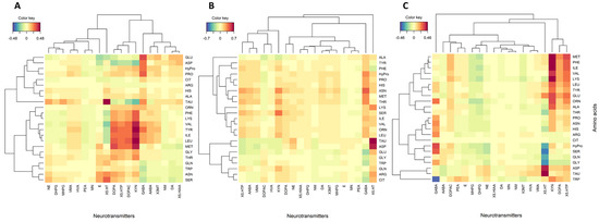 Clustered image maps (no cutoff) between plasma neurotransmitters and proteogenic and non-proteogenic amino acids for (A): healthy control, (B): constipation group (FC+IBS-C), and (C): diarrhea group (FD+IBS-D).