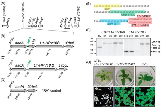 Southern blot analysis of transplastomic lines. (A) Schematic representation of the insertion locus. Numbers refer to positions on the tobacco chloroplast genome, accession Z00044.2 (drawn to scale). (B) Schematic representation of the LTB::L1-HPV16B transgene cassette inserted into the neutral EcoRV site shown in (A). The ndhB sRNA is shown in green. P16S = promoter of the chloroplast 16S rRNA gene. 3′rbcL = the 3′-UTR of the rbcL mRNA from Chlamydomonas reinhardtii. Arrows point in the direction of transcription of the respective genes. (C) same as in (B), but for the L1-HPV18.2 transgene cassette. (D) same as in (B), but for the RV5 control construct. (E) Sequence excerpts from L1-HPV18.2 and LTB::L1-HPV16B transgene cassettes. (F) RFLP analysis of transplastomic lines, where 5.0 µg of cellular DNA was fragmented by SalI. Hybridization was performed with a radiolabeled probe derived from the petG and trnW genes (bar in (A), probe position 68,595–68,872 of Z00044.2). Numbers on the right side of the blots indicate the expected size for restriction fragments: 8670 bp = LTB::L1-HPV16B fragment; 8307 bp = L1-HPV18.2 fragment; 6380 bp = RV5 fragment; 5471 bp = wt fragment. (G) Plants were grown on sucrose-containing MS medium for three weeks (upper row) or germinated on soil and grown for two weeks (lower row).