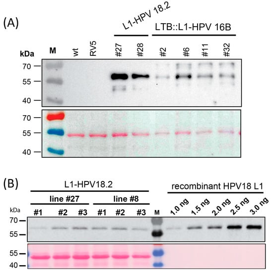 We tested the accumulation of the L1 and LTB::L1 proteins in the transplastomic lines using immunoblot analysis with an antibody that could detect both the HPV16B and the HPV18.2 L1 proteins. We inserted the ndhB sRNA upstream of the two L1 protein versions, which allowed for the production of protein from the downstream cistron. Indeed, all homoplastomic lines accumulated L1 protein in leaves (Figure 2A). This was true for green leaves from L1-HPV18.2 lines #22 and #27, as well as for pale leaves from LTB::L1-HPV16B lines #2, #6, #11, and #32. The sizes of the observed signals matched the expected size of 56.5 kDa for the L1-HPV18.2 protein (Figure 2A). For the LTB::L1-HPV16B protein, the expected size was 69.5 kDa. Signals of about 70 kDa were observed, but there were also additional proteins of smaller size detected (Figure 1A). This could indicate degradation of the LTB::L1-HPV16B protein. No protein was detected in samples extracted from RV5 control plants or wt plants, demonstrating the specificity of the antibody. Next, we quantified the L1-HPV18.2 protein by comparing the soluble proteins from transplastomic plants with defined amounts of recombinant L1 protein on the same gel as reference (Figure 2B). The yield was low, with 0.02% and 0.03% total soluble protein accumulating in lines #27 and #28, respectively. Nevertheless, the immunological analysis of the transplastomic lines indicated that the L1 proteins can be expressed using the ndhB sRNA sequence as a post-transcriptional expression element.