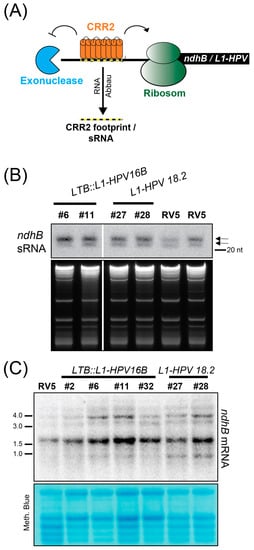 Analysis of endogenous ndhB sRNA and mRNA accumulation in L1-HPV18.2 and LTB::L1-HPV16B lines. (A) Schematic representation of the proposed function of CRR2 for transgene expression. (B) Three µg of total leaf RNA from the indicated genotypes was separated on a denaturing PAA gel, blotted, and hybridized with end-labeled oligonucleotides complementary to the ndhB sRNA (oligo sequence in Supplementary Table S1). Arrows indicate the two known ndhB sRNA isoforms. The ethidium-bromide-stained gels are shown below to illustrate sample loading. (C) Four µg of total leaf RNA from the indicated genotypes was separated on a 1.2% denaturing agarose gel and transferred to nylon membrane. This is the same blot as the one used for the L1-HPV18.2 probing in Figure 3C. After stripping of the L1 probe, ndhB mRNAs were detected using a radiolabeled DNA probe generated by PCR (see Supplementary Table S1 for primers).