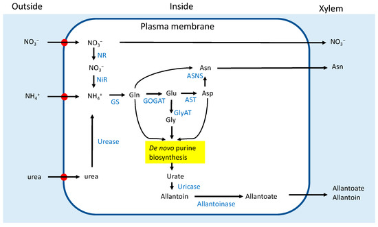 Schematic outline of the absorption and assimilation of NO3−, NH4+, and urea in a root cell. Transporters. ASNS: asparagine synthetase; AST: aspartate aminotransferase; GlyAT: glycine aminotransferase; GOGAT: glutamate synthase; GS: glutamine synthetase (referred to [3,15]).