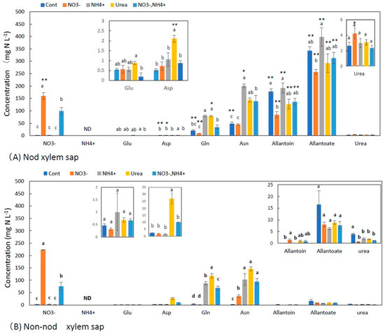 Figure 2A,B show the concentrations of the principal N metabolites in the xylem sap of the nodulated and non-nodulated soybean plants. In the control treatment, the Nod plants that depended only on nitrogen fixation, the concentrations of allantoate (343 mg N L−1) and allantoin (178 mg N L−1) were the highest, followed by Asn (48 mg N L−1), Gln (20 mg N L−1), and urea (2.6 mg N L−1). The concentrations of Glu (0.55 mg N L−1) and Asp (0.52 mg N L−1) were low, and ammonium was not detected. The nitrate treatment increased the NO3− concentrations at 160 mg N L−1 and decreased the allantoate and allantoin concentrations. The concentrations of Gln, Asn, Glu, and Asp did not significantly change with the nitrate treatment compared with the control. The NH4+ and urea treatments resulted in similar metabolite profiles in which the concentrations of Asn and Gln increased several times compared with the control xylem sap, and the concentrations of allantoate and allantoin were not significantly different from the control xylem sap. The 2.5 mM NO3− + 2.5 mM NH4+ treatment showed an increase in NO3−, Asn, and Gln, but the values were lower than those in the 5 mM NO3− treatment.
