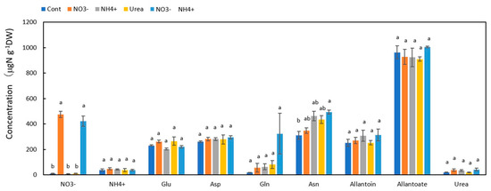 Comparison of the concentrations of the principal N metabolites in the nodules of nodulated soybean plants treated with various N compounds. Treatments: Cont, control with N-free solution; NO3−, 5 mM KNO3; NH4+, 2.5 mM (NH4)2SO4; urea, 2.5 mM urea; NO3− + NH4+, 2.5 mM KNO3 + 1.25 mM (NH4)2SO4. n = 3. Average ± standard error. The different letters on the top of the columns indicate significant differences in the N concentration among the N treatments based on Tukey’s test (p < 0.05).