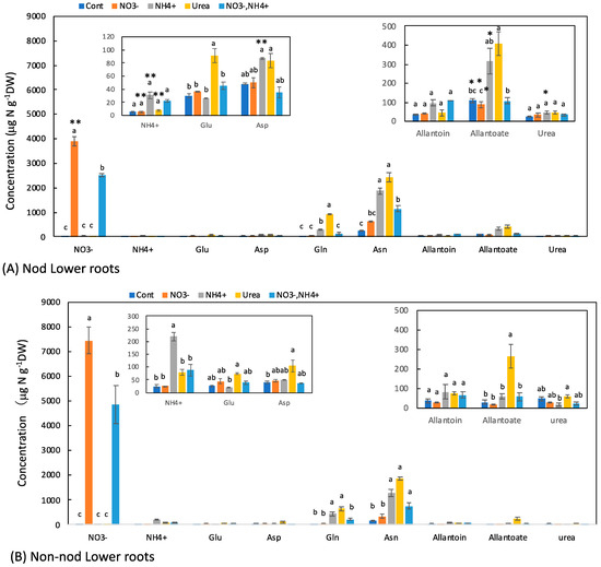 Comparison of the concentrations of the principal N metabolites in the lower roots of the Nod and Non-nod soybean plants treated with various N compounds. The symbols, abbreviations and the explanations of the statistics are the same as in Figure 2.
