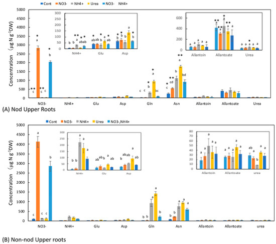 Comparison of the concentrations of the principal N metabolites in the upper roots of the Nod and Non-nod soybean plants treated with the various N compounds. The symbols, abbreviations and the explanations of the statistics are the same as in Figure 2.