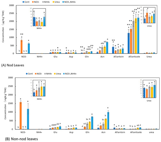 Similar trends were observed in the leaves (Figure 7) and stems (Figure 6). In the leaves of the Nod plants with the Cont treatment, the average concentration of allantoate (1280 μg N g−1DW) was the highest, followed by allantoin (415 μg N g−1DW), Asn (87 μg N g−1DW), Glu (57 μg N g−1DW), Asp (57 μg N g−1DW), Gln (50 μg N g−1DW), and urea (28 μg N g−1DW). In the leaves of the Non-nod plants, the average concentrations of allantoin (85 μg N g−1DW) and Asn (82 mg N g−1DW) were the highest, followed by Glu (47 μg N g−1DW), urea (22 mg N g−1DW), allantoate (22 μg N g−1DW), Asp (17 μg N g−1DW), and Gln (11 μg N g−1DW). The concentrations of allantoate and allantoin in the Nod leaves were significantly higher than those in the Non-nod leaves. The difference in the ureides concentrations might have derived from the nodules. The NO3− concentrations in the leaves of the Non-nod leaves supplied with 5 mM NO3− were significantly (p < 0.01) higher (1580 μg N g−1DW) than in the Nod leaves (842 μg N g−1DW). The application of NO3− + NH4+ resulted in a lower NO3− accumulation compared with 5 mM NO3−. The 5 mM NO3− treatment tended to increase the Asn concentration but did not affect the other N metabolites, including allantoate and allantoin in the Nod and Non-nod stems. The NH4+, urea, and NO3− + NH4+ treatments increased the concentrations of Asn and Gln in the leaves. The concentrations of allantoate and allantoin were significantly higher in the leaves of the Nod plants than in the Non-nod plants (Figure 7).