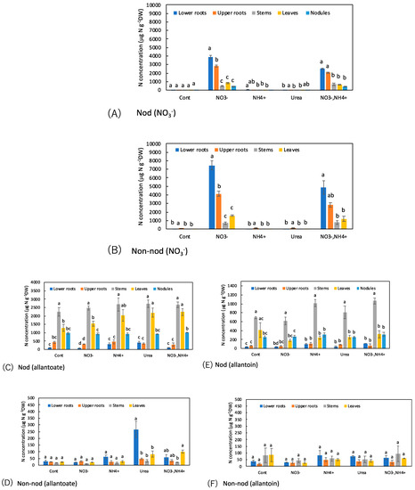 Figure 8C–F shows a comparison of the concentrations of ureides, allantoate, and allantoin, among the organs of the Nod and Non-nod plants. In the Nod plants, the concentration trends affected by the N treatments were relatively similar between allantoate and allantoin, although the concentration of allantoate was higher than allantoin. The highest concentration of allantoate and allantoin was observed in the stems, followed by the leaves, nodules, upper roots, and lower roots. The N-treatments did not change the concentration patterns of allantoate and allantoin in the Nod plants. The concentrations of allantoate and allantoin in the Non-nod plants were not different among the organs, except for the allantoate concentration in the lower roots with the urea treatment.