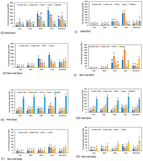 Figure 8G–J shows the concentrations of amides, Asn, and Gln among the organs. In the Cont Nod plants, the concentration of Asn was significantly higher in the stems. When NO3− was applied, the concentration of Asn in the lower and upper roots increased. When NH4+ or urea was supplied to the culture solution, the concentrations of Asn, especially in the lower and upper roots, increased. The trends in the concentrations of Gln among the organs were similar to those of Asn, although the concentrations were lower than Asn. The concentration of Asn in the Non-nod plants was low in the control treatment, and the NH4+ or urea application increased the Asn concentration in the lower and upper roots. The applications of NH4+ or urea increased the concentrations of Gln, especially in the upper roots.