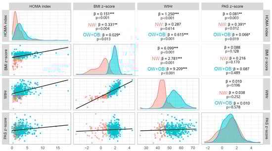 The red lines delineate the distribution of variables in NW individuals and the blue lines delineate the distribution of variables in excess weight (OW + OB) individuals. The red dots in the scatter plots represent NW individuals and the blue dots represent individuals with excess weight (OW + OB).
