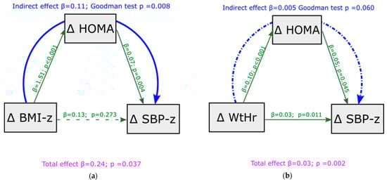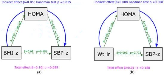 On the basis of the significance of the regression coefficients at baseline, a mediation analysis was performed to deeply understand the role of the HOMA-index as possible mediator between BMI z-score or WtHr on the SBP z-score. The mediation analysis was performed to evaluate the role of HOMA-index in mediating the relationship between BMI z-score, WtHr z-score, and BP z-score values under baseline conditions and the effect of changes in BMI z-score and WtHr on changes in BP z-scores after the follow-up period.