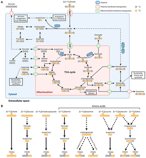 Endogenous citrate synthesis is influenced by substrates fueling carbons into the TCA cycle metabolism, such as amino acids and precursors of acetyl-CoA. Isotopically labeled carbon tracers, such as 13C glutamine and glucose tracers (Figure 2B) are commonly applied to quantify citrate metabolism [6,22,65]. Labeled fatty acids, ketone bodies, and amino acids further supply carbons for citrate synthesis (Figure 2B) [43,66,67,68,69,70]. More specific tracers, such as 13C and 2Hlabeled citrate, are advantageous to trace the fate of citrate in a living organism [15,71]. For example, while red blood cells (RBC) contain no mitochondria, citrate tracer approaches indicated citrate uptake and utilization in RBCs [71]. Notably, RBCs take up extracellular citrate via the mitochondrial transporter protein CTP located on the plasma membrane [71,72]. Thus, citrate uptake might be facilitated by alternative strategies including transporters that have not been annotated yet.