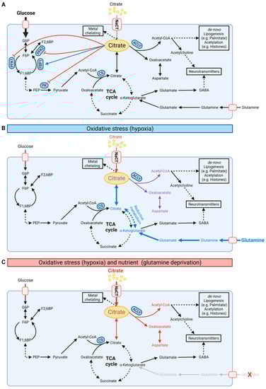 Schematic illustration of cellular citrate homeostasis. (A) Citrate is involved in multiple biochemical pathways under normoxic conditions. Cytosolic citrate inhibits glycolysis via PFK1, PFK2, and PK while stimulating FBP1 in gluconeogenesis. Cytosolic citrate is cleaved by ACLY to oxaloacetate and acetyl-CoA, thus influencing de novo lipogenesis, protein acetylation, and synthesis of neurotransmitters. (B) Under oxidative stress such as hypoxia conditions, cells reprogram citrate metabolism and increase reductive carboxylation metabolism for de novo lipogenesis. (C) NaCT facilitates citrate transport and metabolism under glutamine deprivation and oxidative stress. G6P: glucose-6-phosphate; F6P: fructose-6-phosphate; F1,6BP: fructose-1,6-bisphosphate; PEP: phosphoenolpyruvate; PFK: phosphofructokinase; PK: pyruvate kinase; FBP1: fructose 1,6-bisphosphatase; ACLY: ATP-citrate lyase; CS: citrate synthase; NaCT: sodium-coupled citrate transporter. Black, red, and blue fonts distinguish the carbon sources glucose, citrate, and glutamine, respectively. In (B), purple font indicates the combined carbon sources citrate and glutamine. Bold fonts and bold arrows indicate increasing fluxes. In (A), the blue arrow indicates stimulation and the red arrows inhibition. (Created with BioRender.com).