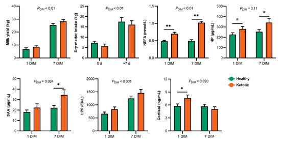 Bar plot indicating the changes in dry matter intake, milk yield, non-esterified fatty acids (NEFA), haptoglobin (HP), serum amyloid A (SAA), lipopolysaccharide (LPS), and cortisol between the healthy and ketotic cows at 1 and 7 days in milk (DIM). 0.05 ≤ # p < 0.1, * p < 0.05, and ** p < 0.01.